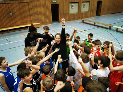 Außerdem gewannen sie den Besuch von US Profi Jordan Notch, der es sich nicht nehmen ließ, am vergangenen Freitag das AG-Training zu leiten. Sprachlich überraschten die Grundschüler von Beginn an und es schien, als ob alle Kinder Tag für Tag ihren Basketballunterricht auf Englisch erleben würden. Begeistert nahmen sie die Dribbel- und Wurftipps von Notch an und schnell wurden alle Treffer laut auf Englisch mitgezählt. Als besonderes Highlight spielte der 2,03 Meter große Center am Ende auch noch mit, feierte jeden Wurf hoch, setzte seine Mitspieler mit tollen Pässen in Szene und hatte einfach unglaublich viel Spaß mit diesen tollen Kids.