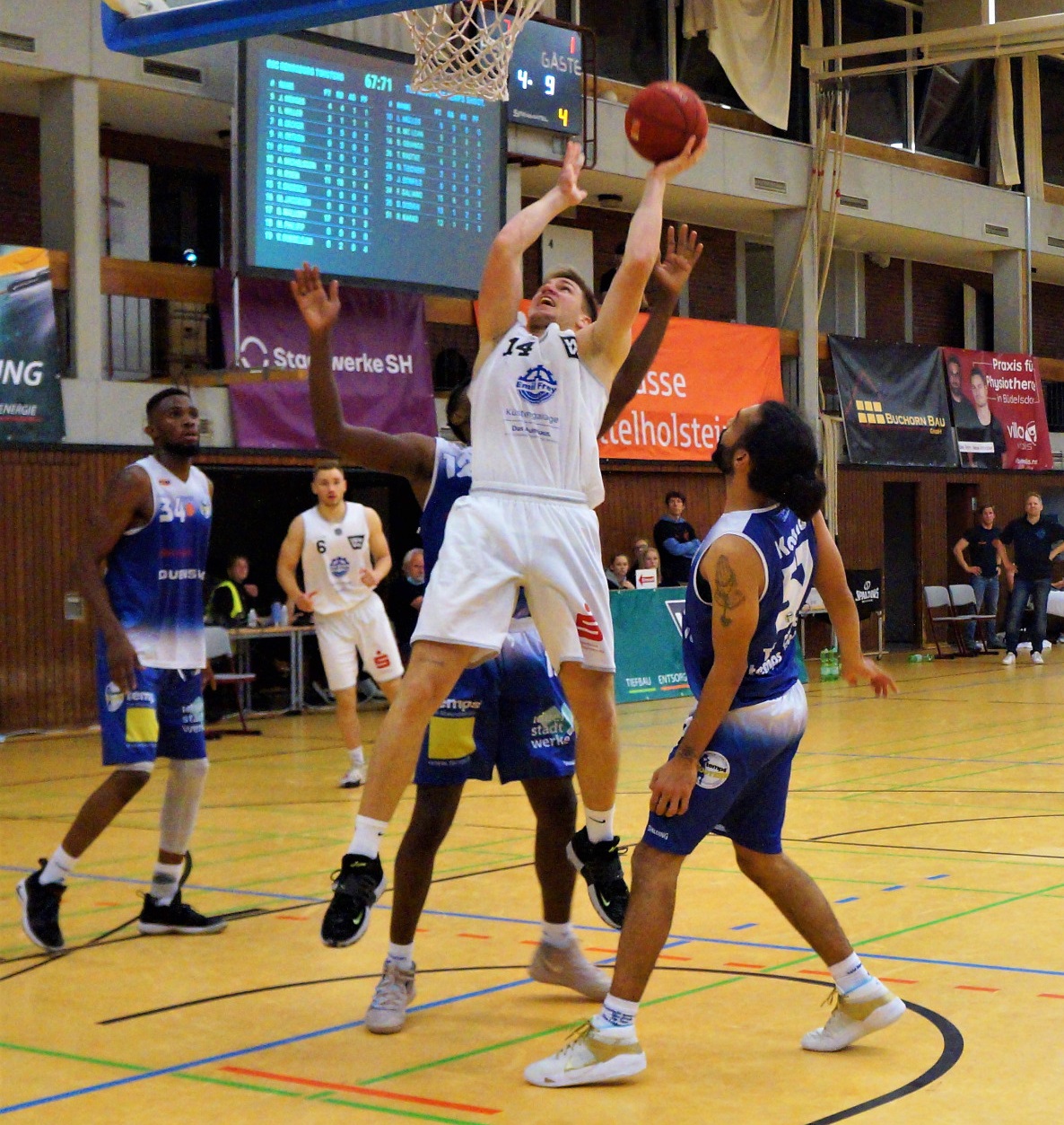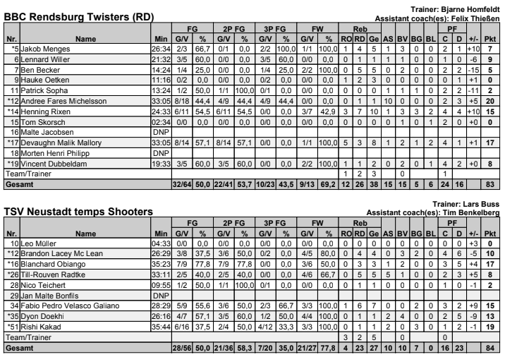 Andrée Michelsson – mit 20 Punkten und zehn Assists überragend – wuchtete den Ball jenseits der Dreierlinie ins Netz, Vincent Dubbeldam löste mit seinem Dunk zum 47:41 einen Jubelsturm auf der Tribüne aus. Als die Rendsburger auf 52:41 davonzogen, schimpfte Neustadt-Coach Lars Buss („Ich glaub, ich spinne. Ich dreh durch.“) vor sich hin: „Manchmal brauchen die Jungs ein paar richtige Ansagen“, schmunzelte der ehemalige Bundesligaprofi nach dem Match. Plötzlich holte der hohe Favorit, der in der Vorwoche ohne Rishi Kakad (19 Punkte) und Fabio Galiano (15) Topfavorit Aschersleben mit 95:90 bezwungen hatte, Punkt um Punkt auf, führte nach einem 12:0-Lauf plötzlich mit 60:57.