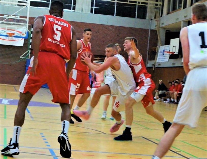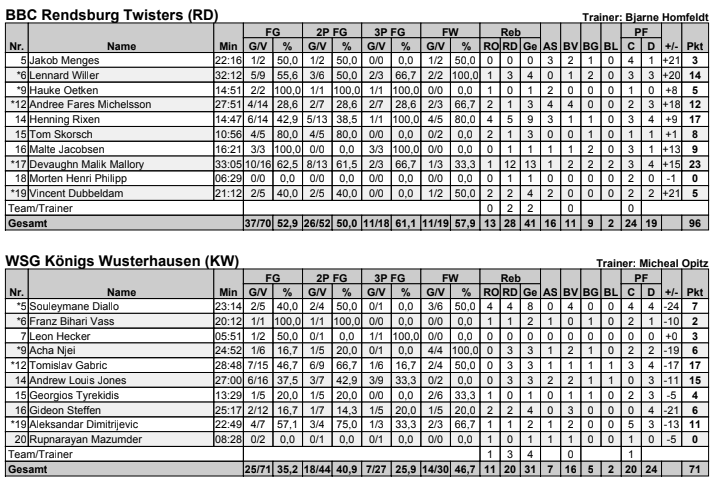 Nach einem kurzen Aufbäumen der Gäste zu Beginn der zweiten Halbzeit (64:45), hatten die Rendsburger schnell wieder alles im Griff. Der stark aufgelegte Malte Jacobsen traf seine Dreier und verteidigte Wusterhausens besten Tomislav Gabric sehr gut, während US-Neuzugang Mallory seine Größenvorteile ausspielen konnte, indem er die meisten Rebounds einsammelte (13) und seine Würfe hochprozentig versenkte (62,5%).
