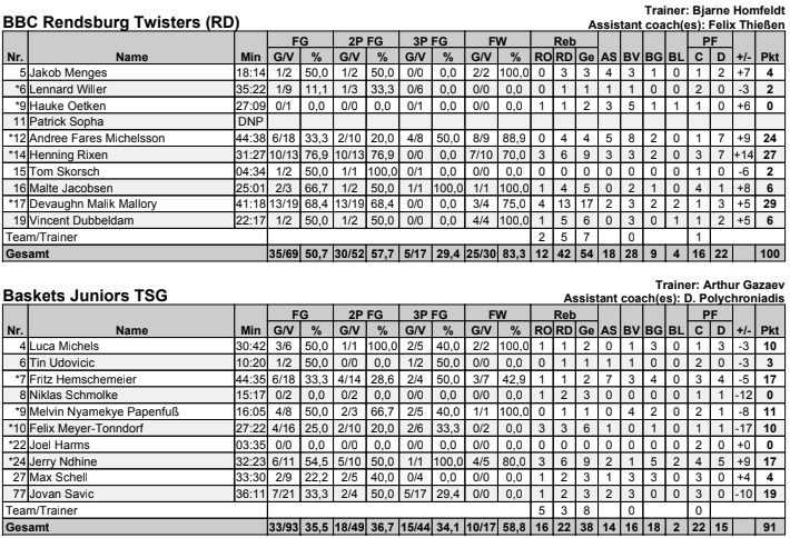Erstmals absetzen konnten sich die Rendsburger im zweiten Viertel. Insbesondere Mallory traf seine Würfe extrem hochprozentig (68%) und dominierte zudem die Rebounds (17). Auch im dritten Viertel setzte sich das Homfeldt-Team weiter ab.