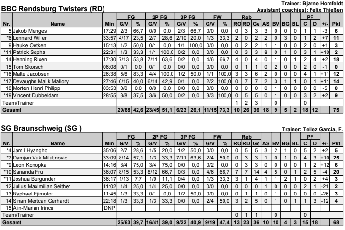Im zweiten Viertel furios aufspielende Twisters holten sich mit 75:68 (13:15, 42:24, 60:43) gegen die SG Braunschweig den dritten Sieg in Serie. Nach schwachem Start (3:15) spielten die Rendsburger eine herausragende Verteidigung, ließen keine einfachen Würfe mehr zu und konnten sich über zahlreiche Schnellangriffe eine komfortable Führung erspielen, die sie bis zum Ende nicht mehr hergaben.