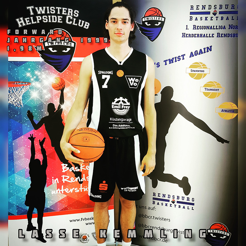Mit dem Kieler Lasse Kemmling haben die Twisters auf der Flügelposition einen neuen und sehr athletischen Spieler gewinnen können, der künftig mit der Nummer 7 auflaufen wird. Der 23-jährige hat das Basketballspielen in Hamburg beim AMTV in Rahlstedt gelernt und dort seine gesamte Jugendzeit bis in die Herren verbracht. Nach seinem Abitur begann er an der Christian-Albrechts-Universität in Kiel ein Studium im Bereich Sportwissenschaften und Pädagogik und spielte zunächst für den Kieler TB in der 2. Regionalliga Nord, als auch zuletzt dem TSV Kronshagen.